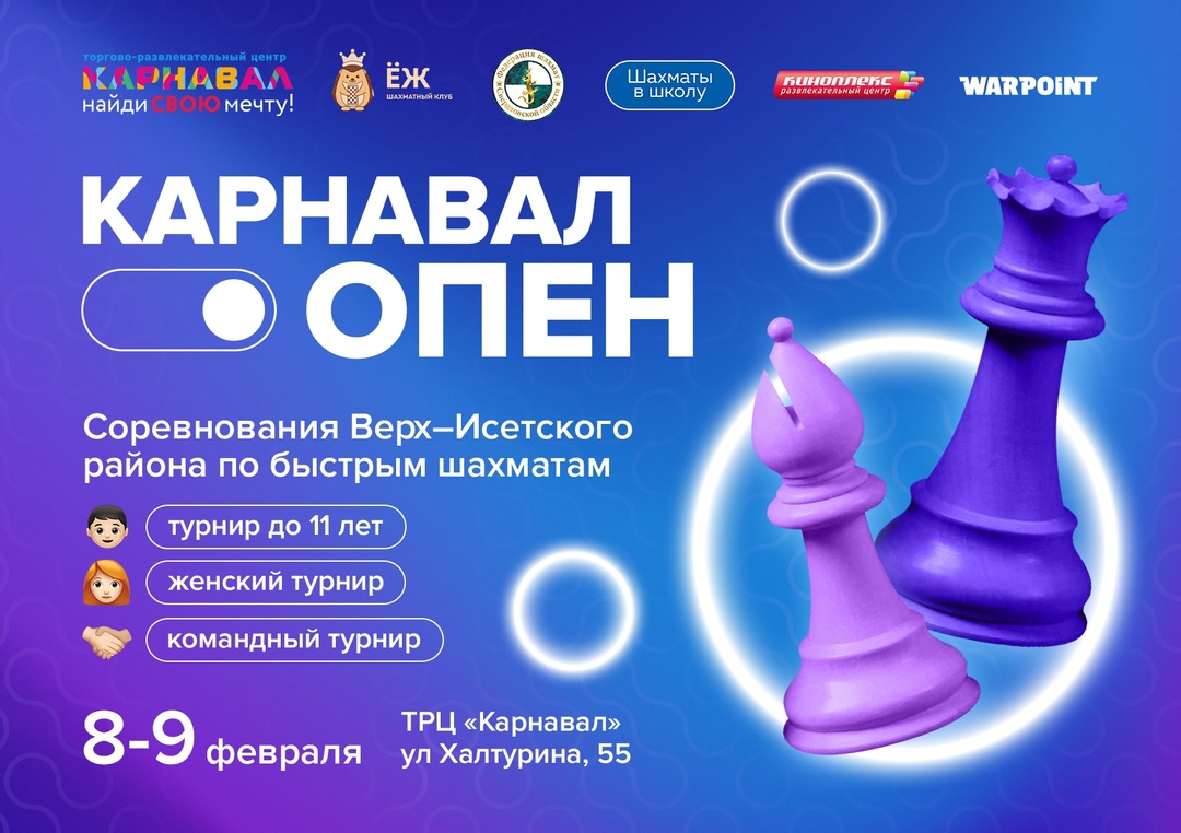 В первых числах мая в Екатеринбурге состоялся ежегодный турнир по быстрым шахматам «Карнавал опен». Соревнования проходили 1 и 2 мая на площадке ТРЦ «Карнавал». Мероприятие привлекло рекордное число участников – всего в различных дисциплинах сыграло 346 шахматистов.